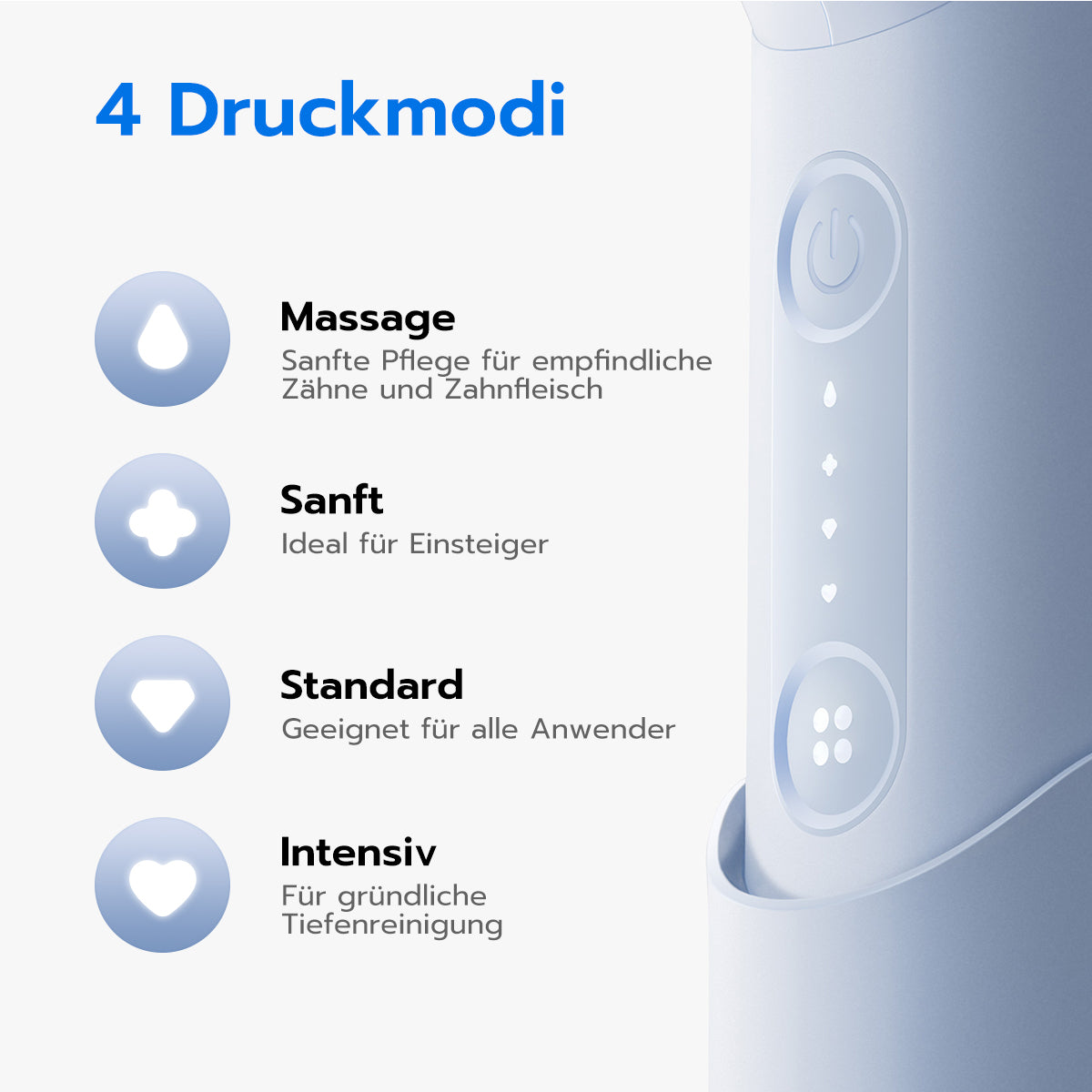 Wählen Sie aus vier Reinigungsmodi mit individuell einstellbarem Wasserdruck – ganz nach Ihren Bedürfnissen. Der C10 merkt sich den zuletzt verwendeten Modus und verfügt über eine benutzerfreundliche Ein-/Aus-Taste, die sowohl auf sanftes Antippen als auch auf festen Druck reagiert – für maximale Kontrolle ganz nach Ihrem Geschmack.